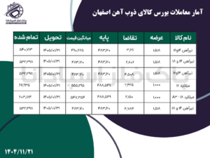 خانه - اخبار - آمار معاملات بورس کالا ذوب آهن اصفهان آمار معاملات بورس کالا ذوب آهن اصفهان پاک فلز 21 بهمن, 1404 0 دیدگاه بورس کالا